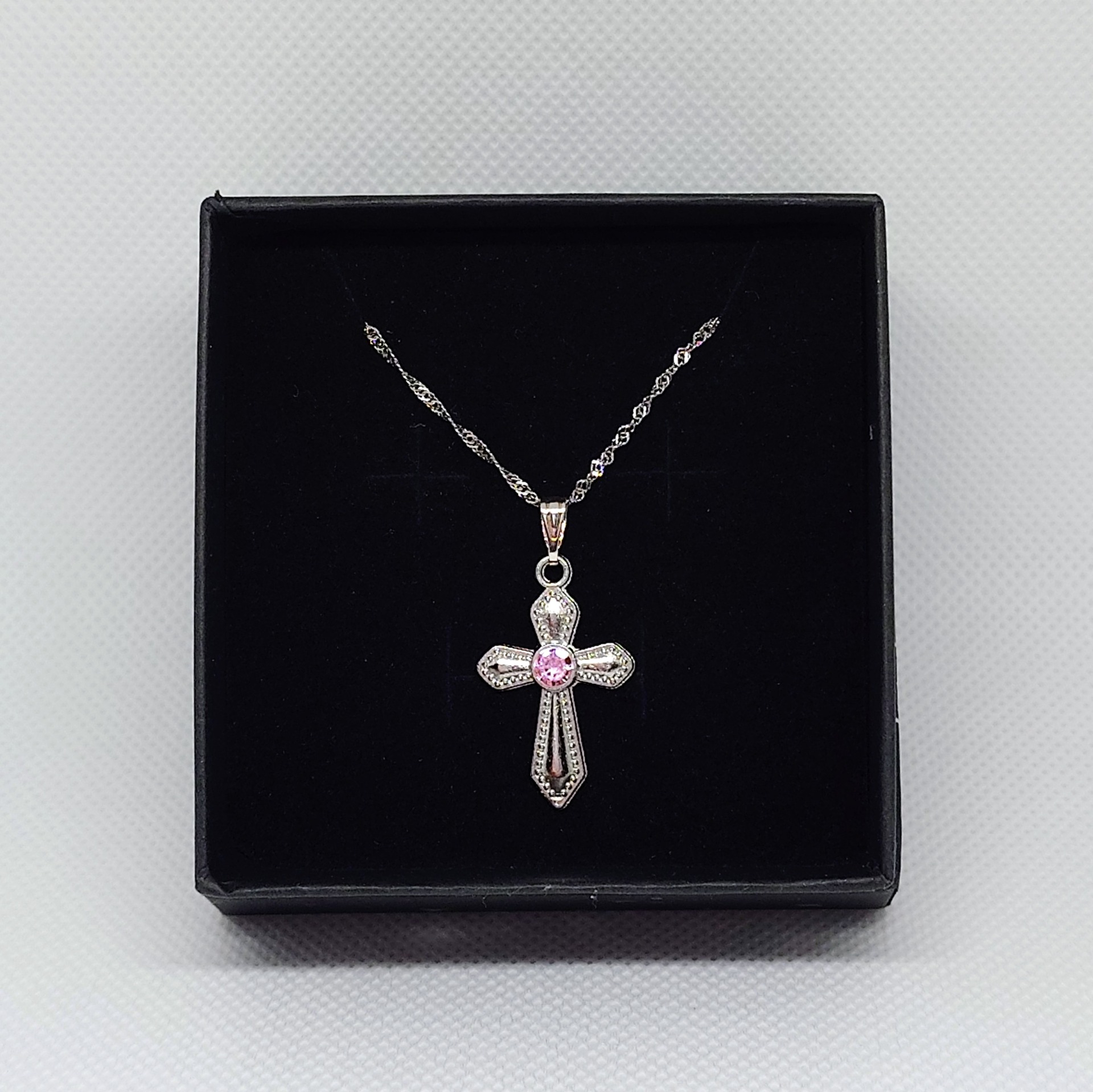 HOPEINEN KETJU 45cm RISTI -riipuksella (pinkki kivi)