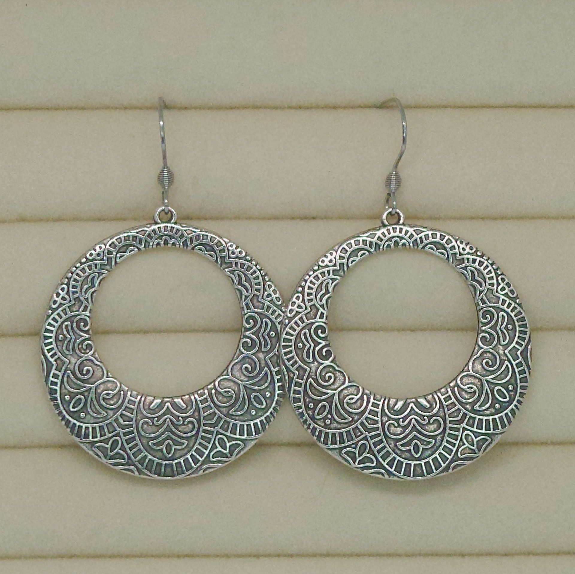 Suuret ja näyttävät renkaat, joissa kaunis pitsikuvio. Renkaiden halkaisija n.37mm.