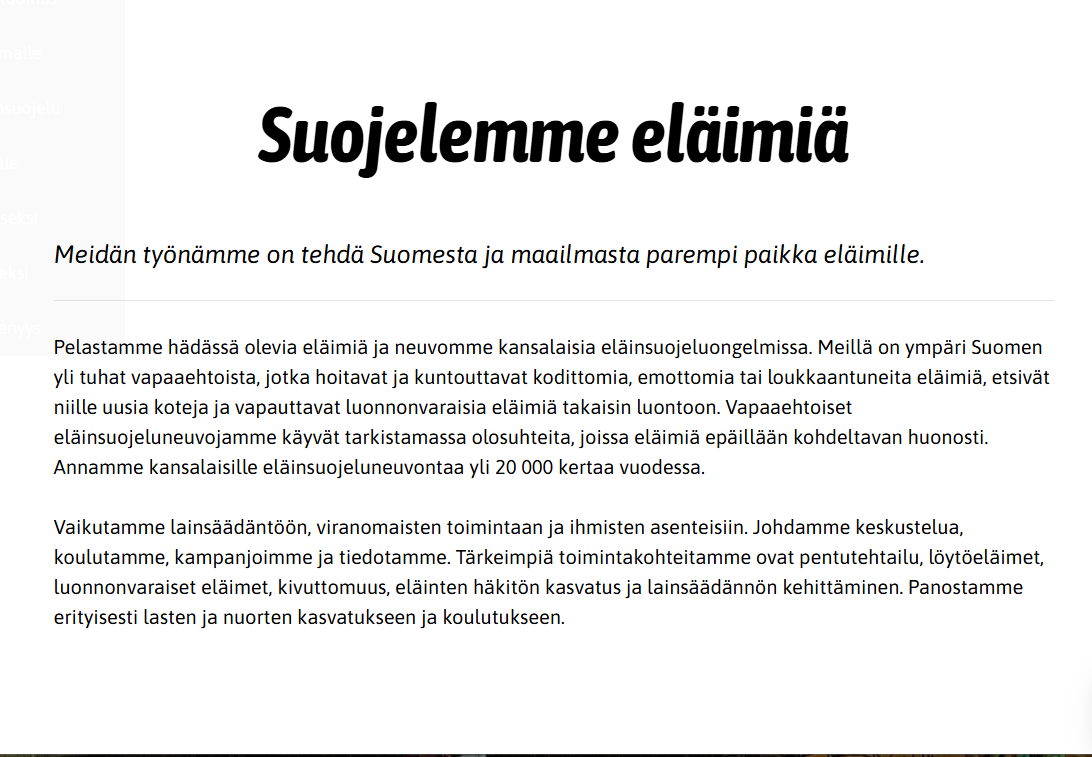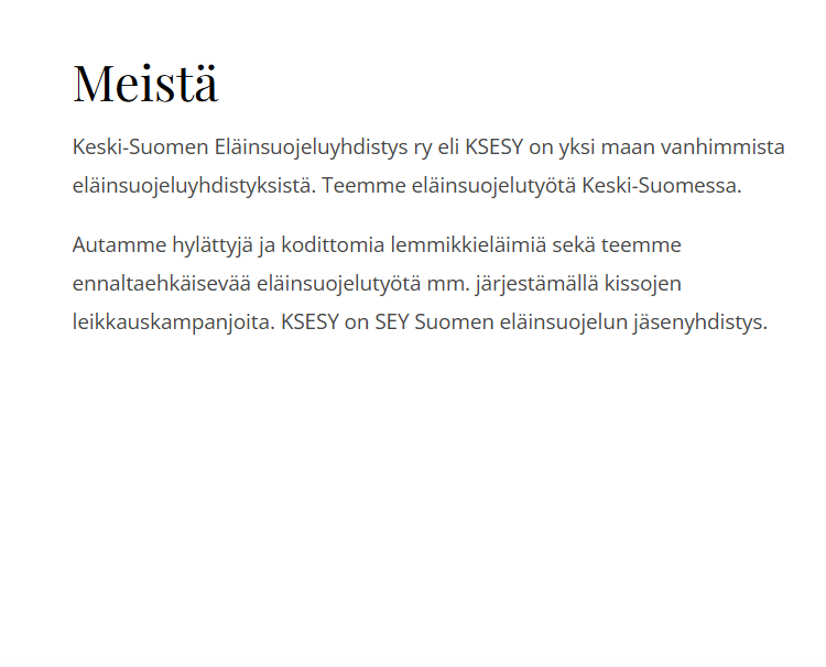 "Teemme eläinsuojelutyötä Keski-Suomessa ja Koillismaassa. Vapaaehtoistyöhön perustuva toimintamme rahoitetaan jäsenmaksuilla, lahjoituksilla, eläinten luovutusmaksuilla ja varainhankinnalla. Autamme hylättyjä ja kodittomia eläimiä sekä teemme ennaltaehkäisevää eläinsuojelutyötä muun muassa järjestämällä kissojen leikkauskampanjoita. Olemme SEY Suomen eläinsuojelun jäsenyhdistys. Lue lisää toiminnastamme alla olevaa linkkiä napauttamalla."